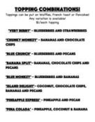 Toppings available are: Blueberries, Strawberries, Banana, Pecan, Coconut, Pineapple & Chocolate Chip. Seasonal toppings include Pumpkin and Candy Cane.